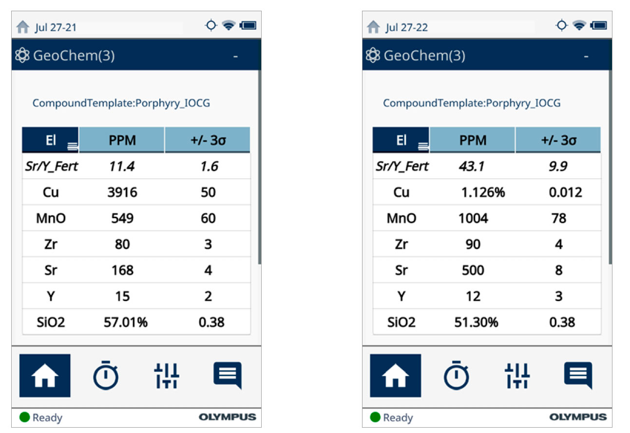 使用奧林巴斯Vanta手持式XRF分析儀上的偽元素功能,可隨時在分析儀屏幕上顯示任何感興趣的比率。此外,化合物顯示功能可使Vanta分析儀顯示與單個元素相結合的氧化物。分析儀在檢測過程中完成這些計算,如上圖所示。